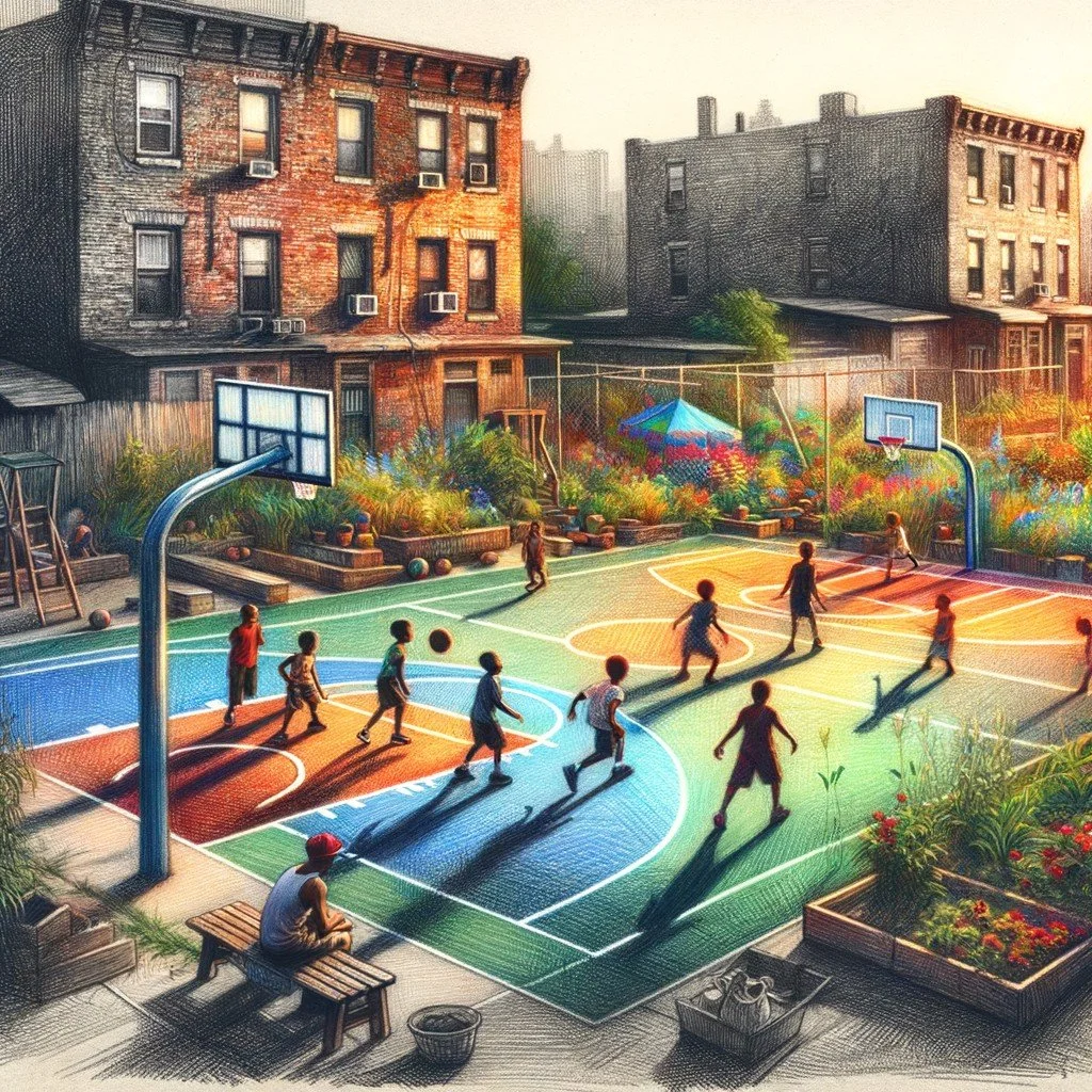 We envision a vibrant outdoor space in the back of the building, featuring a basketball court alongside a community garden. This area will provide a dynamic environment for residents to engage in sports and physical activity while fostering community connections through gardening. The basketball court will serve as a hub for friendly competition, while the garden will offer opportunities for individuals and families to cultivate plants and connect with nature, promoting health and community spirit.